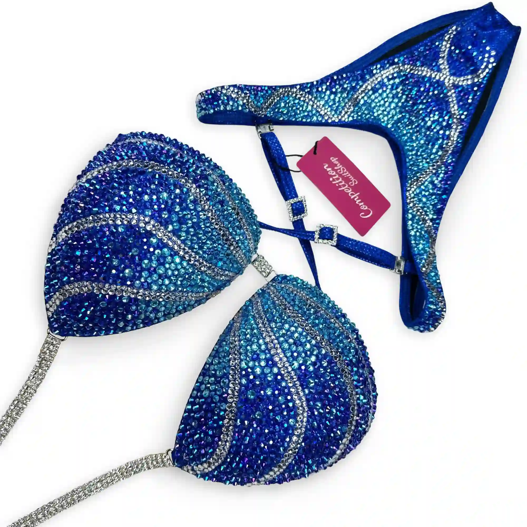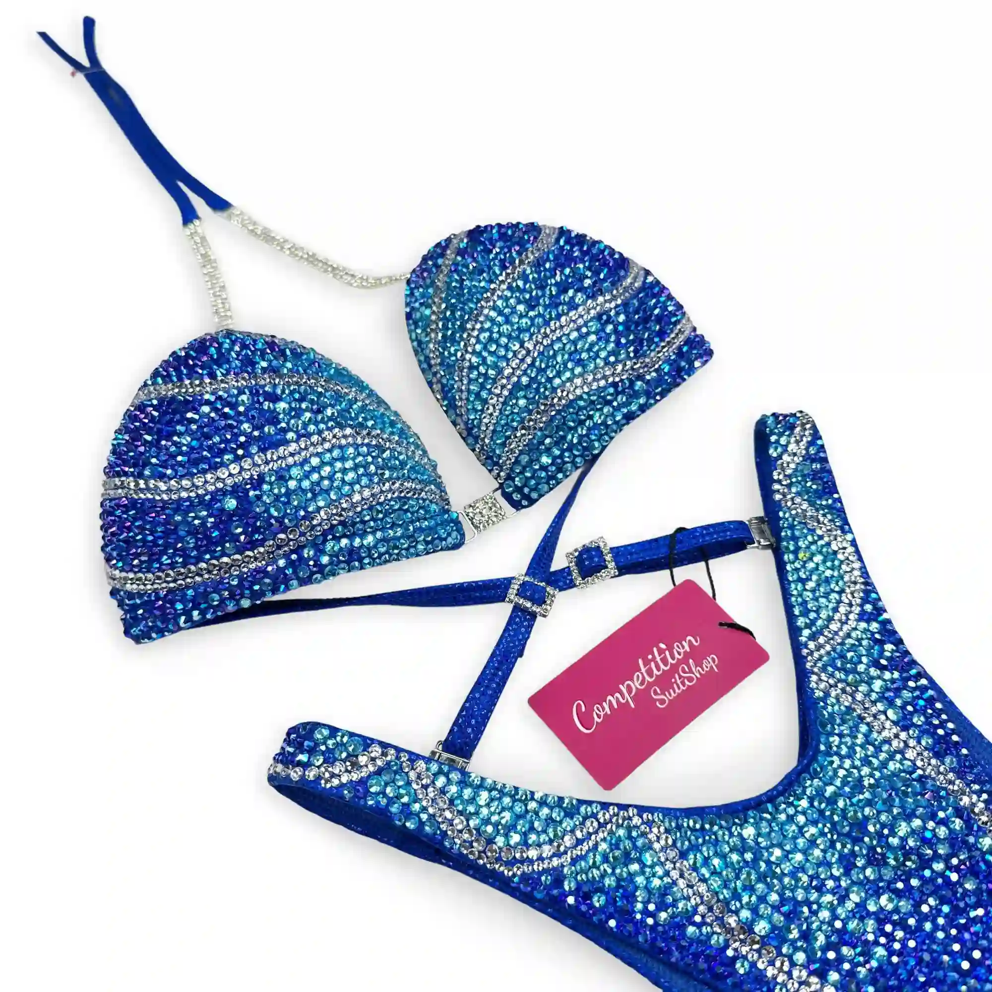 Own the stage with confidence in our Ocean Blue Mirage Figure Competition Suit (F1054)— a show-stopping piece from our premium figure competition suit collection. Expertly handcrafted to meet the standards of NPC, IFBB, OCB, and WBFF and many other federations, this suit is designed for competitors who demand both performance and elegance in every detail.